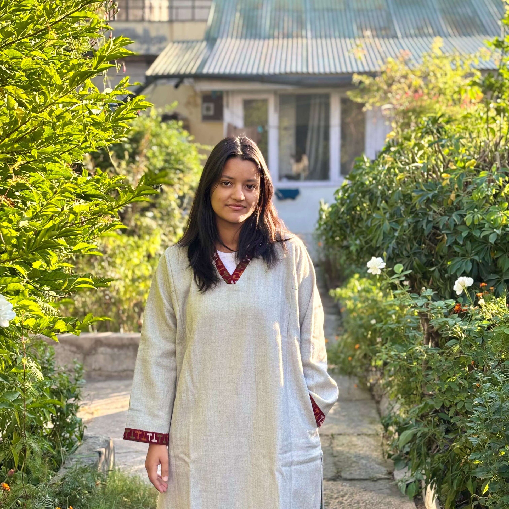 This elegant grey Merino wool Pheran is handcrafted in Kullu and adorned with a classic Kullu patti border. Lightweight yet warm, it’s the perfect fusion of tradition and comfort for winter.