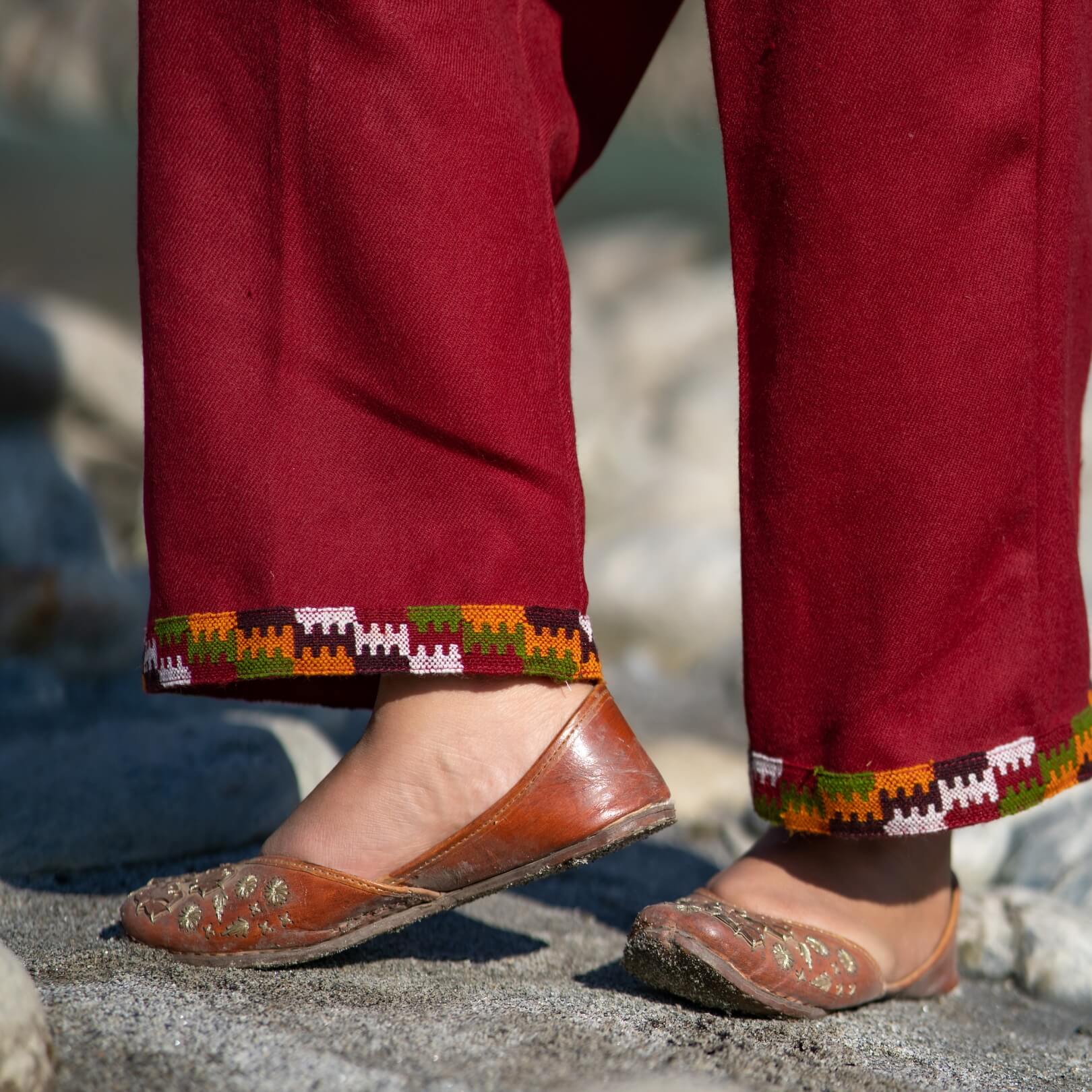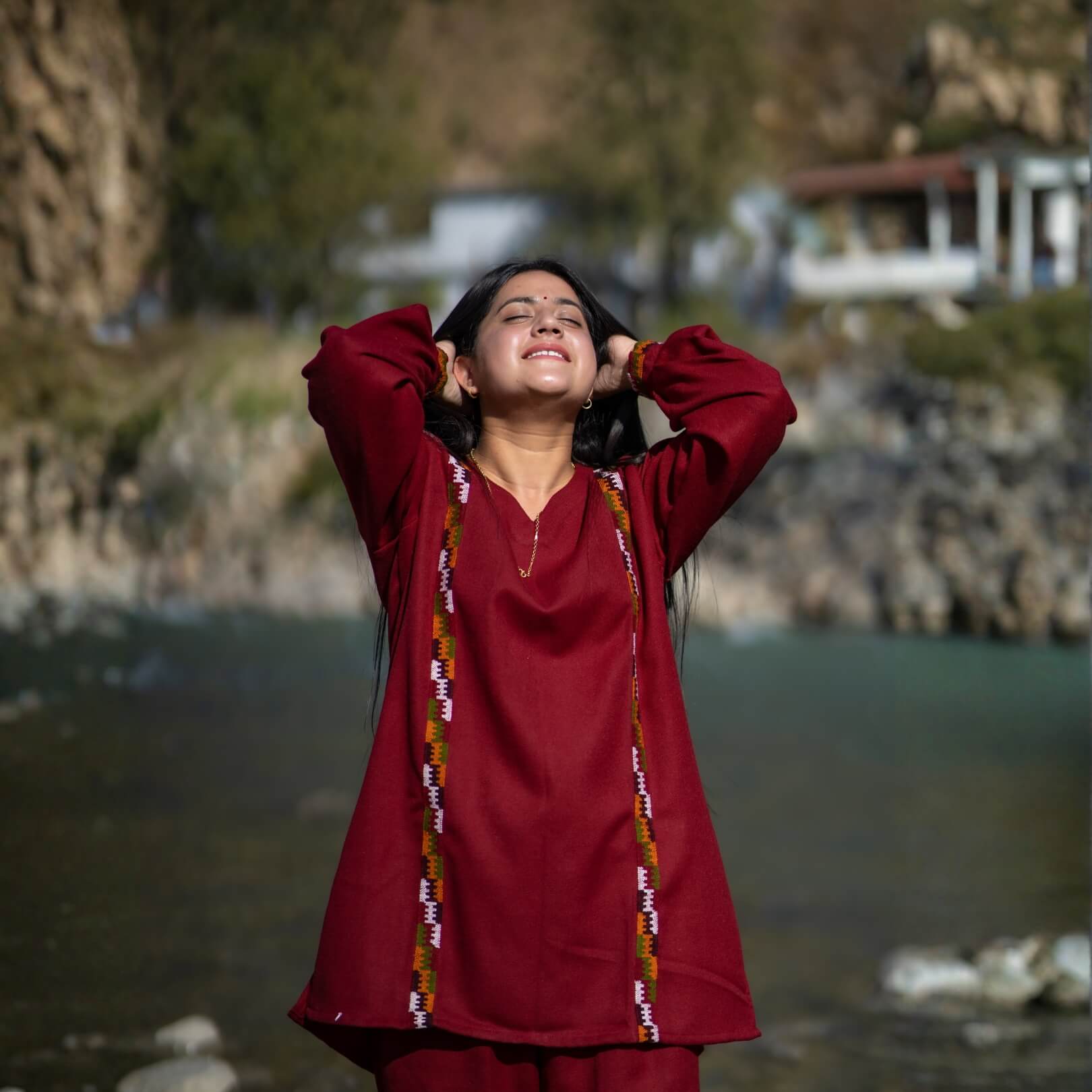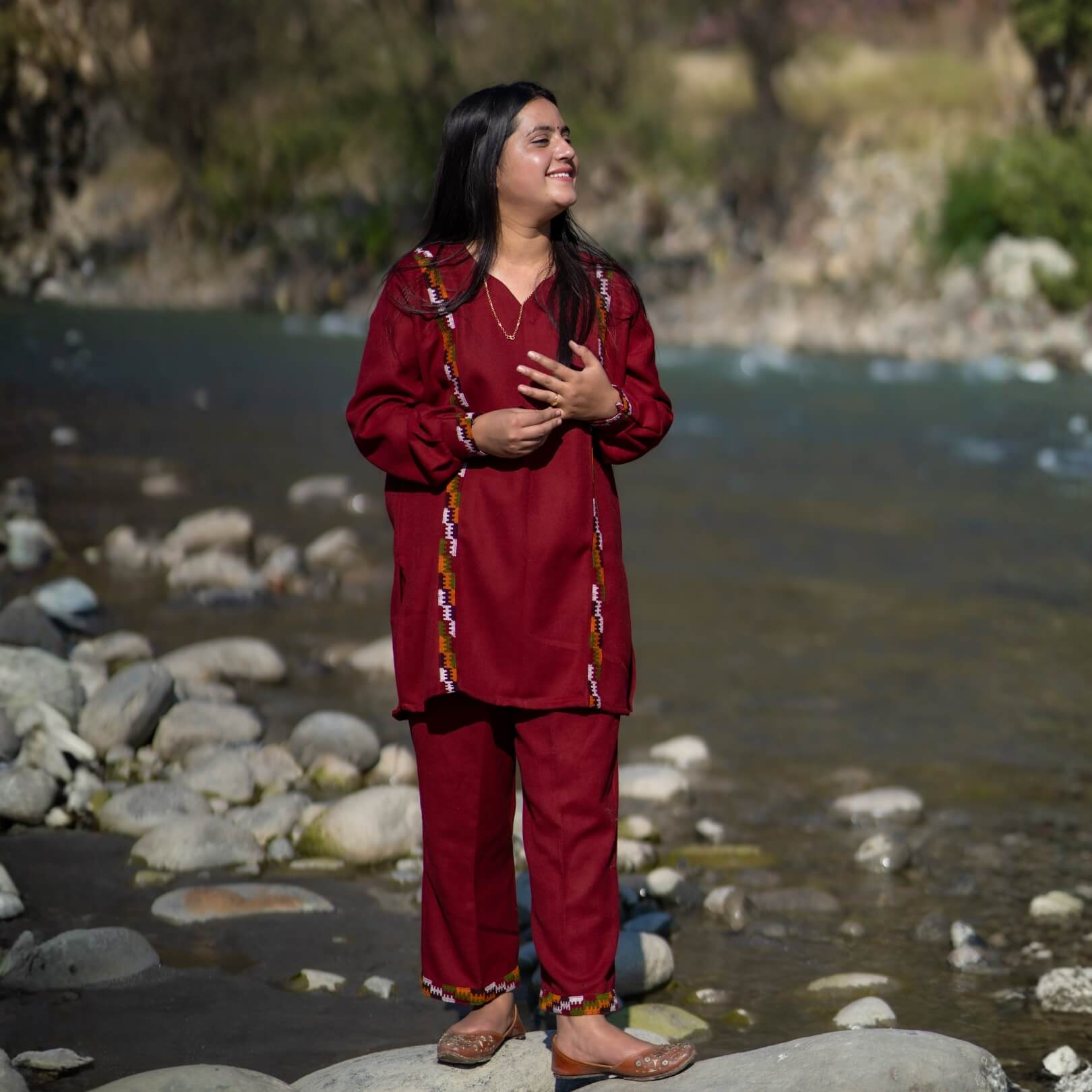 Our women’s merino wool co-ord set in Red color with kangha Design Patti is thoughtfully handcrafted using 100% pure merino wool (except Kullu Patti made from cashmilon) to offer superior softness, warmth, and breathability for winter wear. Designed for comfort without compromising on style, this co-ord set is perfect for daily outings, relaxed travel looks, work-from-home days, or cozy evenings.