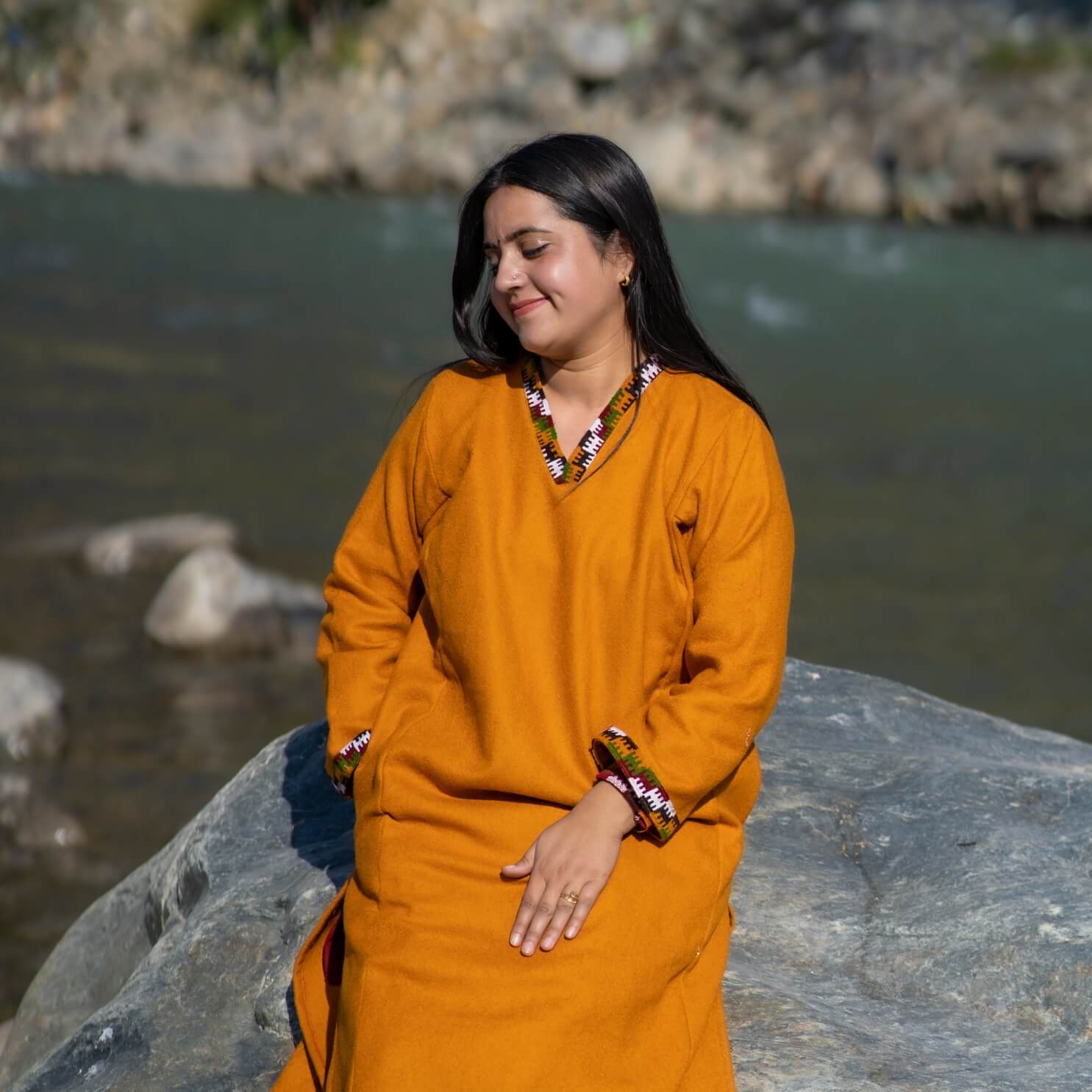 A warm and elegant Himachali Pheran handcrafted from fine Merino wool in a rich mustard hue. Finished with a traditional Kullu patti border, this piece blends heritage artistry with everyday comfort.